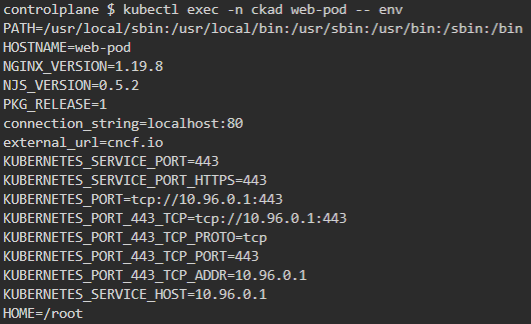 kubectl create configmap web-config --from-literal=connection_string=localhost:80 --from-literal=external_url=cncf.io -n ckad