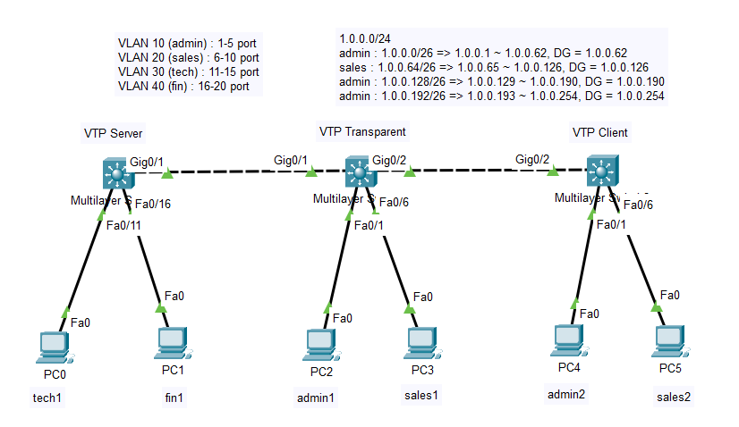 VTP Transparent는 VLAN 정보를 통과시켜 주기만 하기 때문에 직접 VLAN 정보와 포트를 등록해주어야 한다.