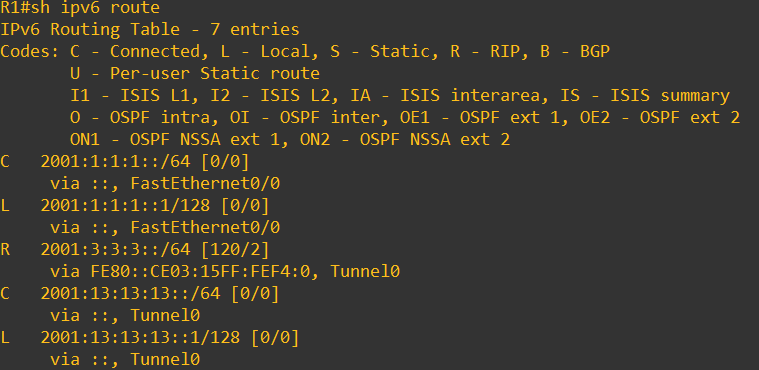 여기까지 설정 후 R1에서 2001:13:13:13::2로 ping test 실시하면 정상적으로 Ping이 도달한다.